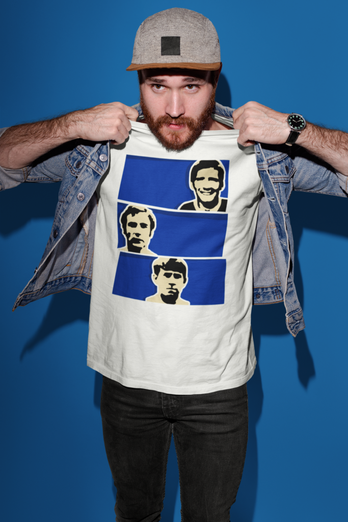The Holy Trinity: Kendall, Ball, and Harvey Celebrate the greatest midfield trio to ever grace the royal blue shirt. Howard Kendall, Alan Ball, and Colin Harvey dominated the late sixties with a level of skill and tenacity that has never been matched. This tee honors the legends who are now immortalized in bronze outside the stadium.
