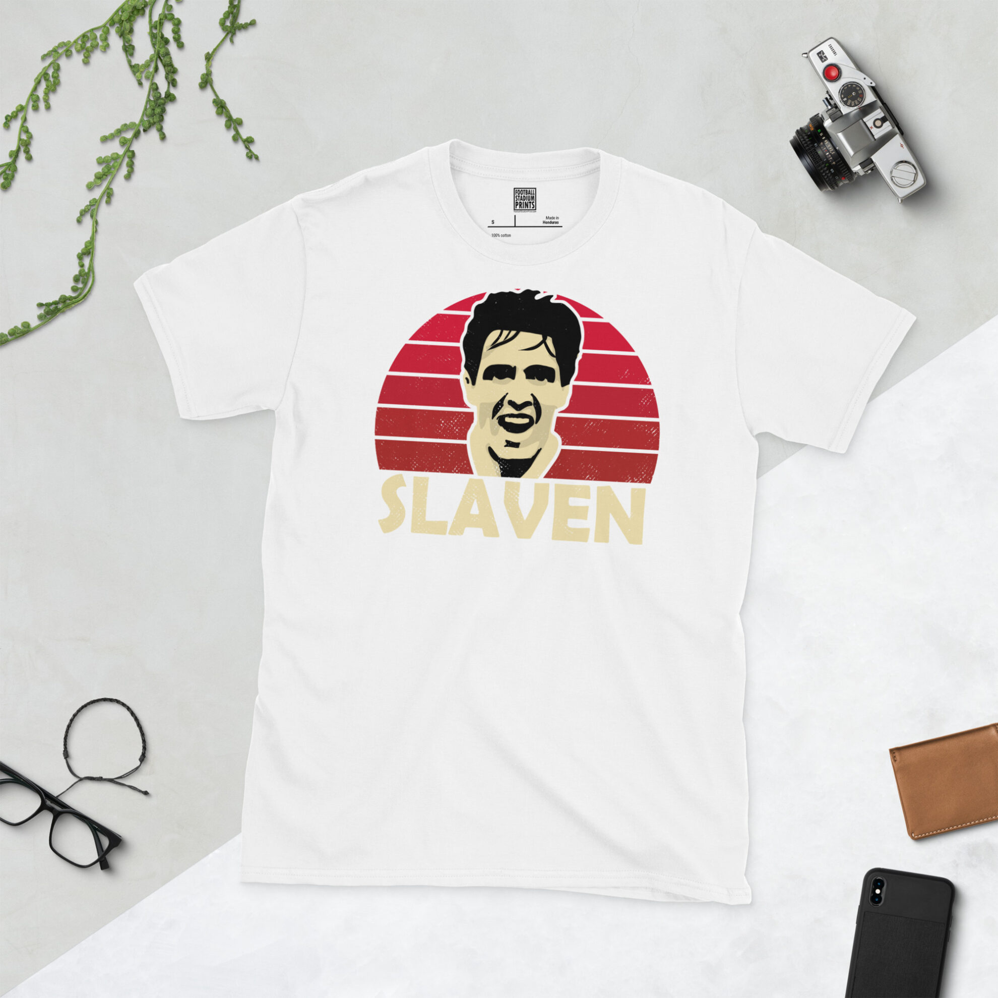 Honour a true Teesside hero with this superb Bernie Slaven retro T-shirt! The design features an artistic, distressed portrait of the legendary striker, set against a striking red striped sunburst background that perfectly matches the famous colours of Middlesbrough FC. His surname, SLAVEN, is proudly displayed in bold text beneath the main graphic.