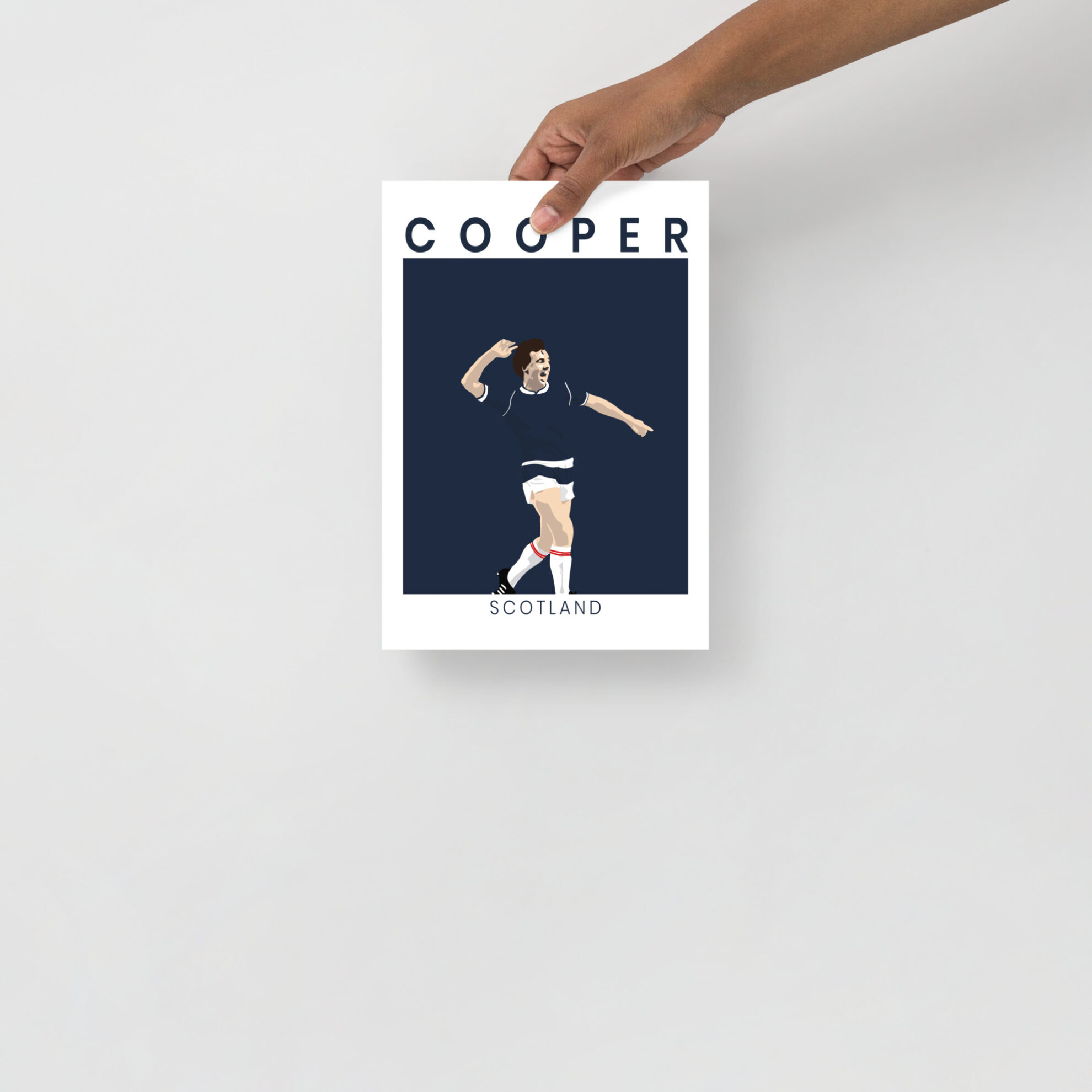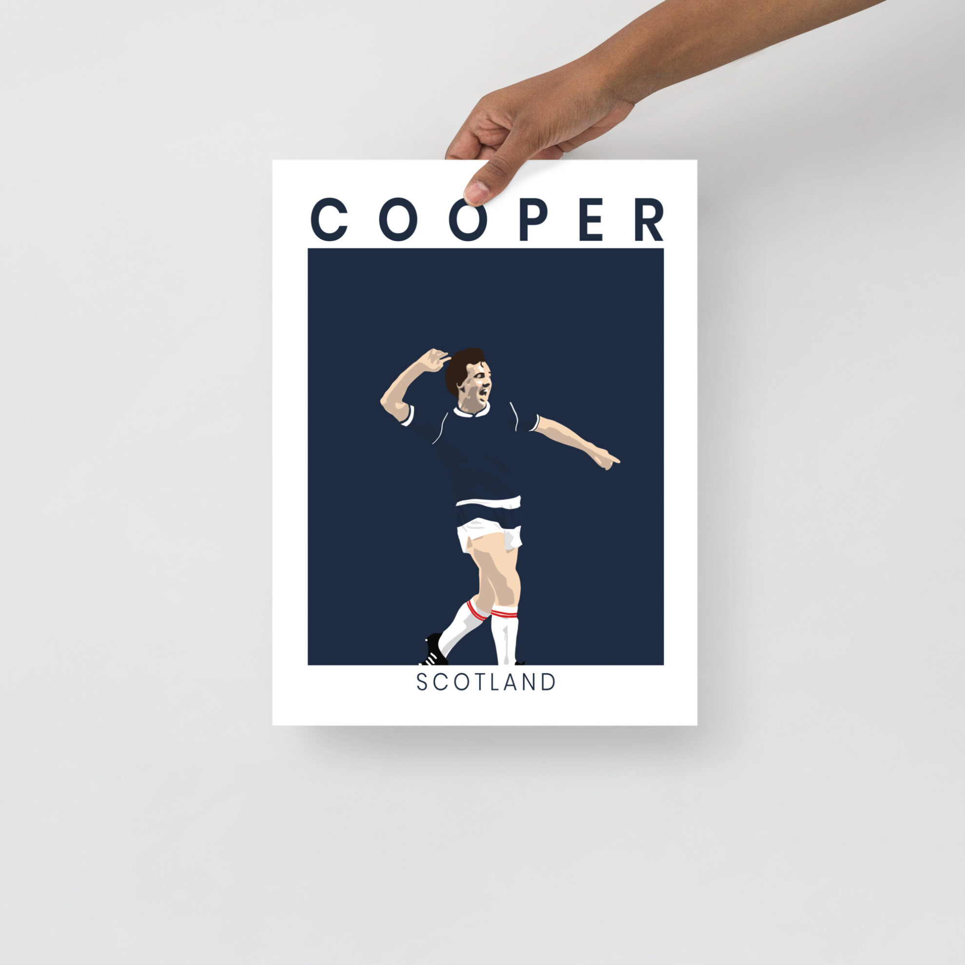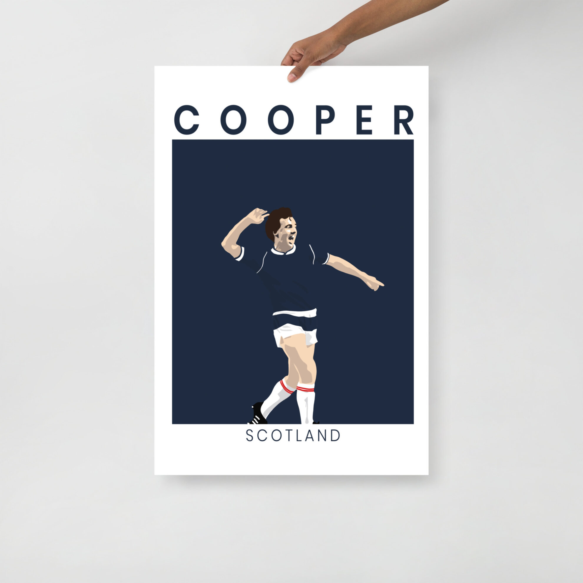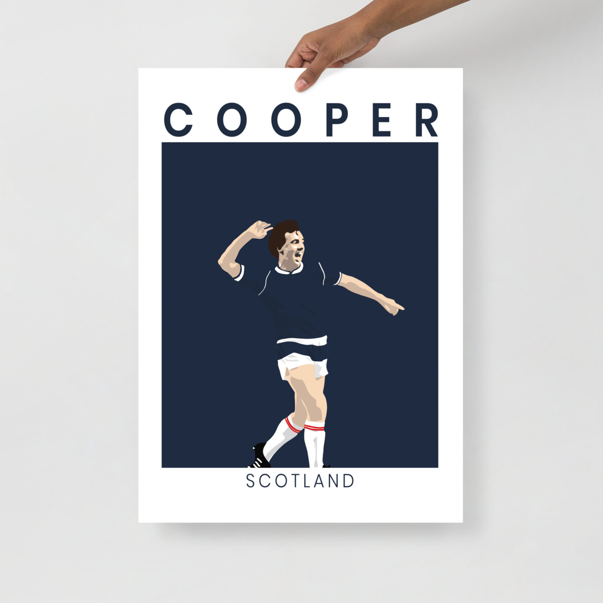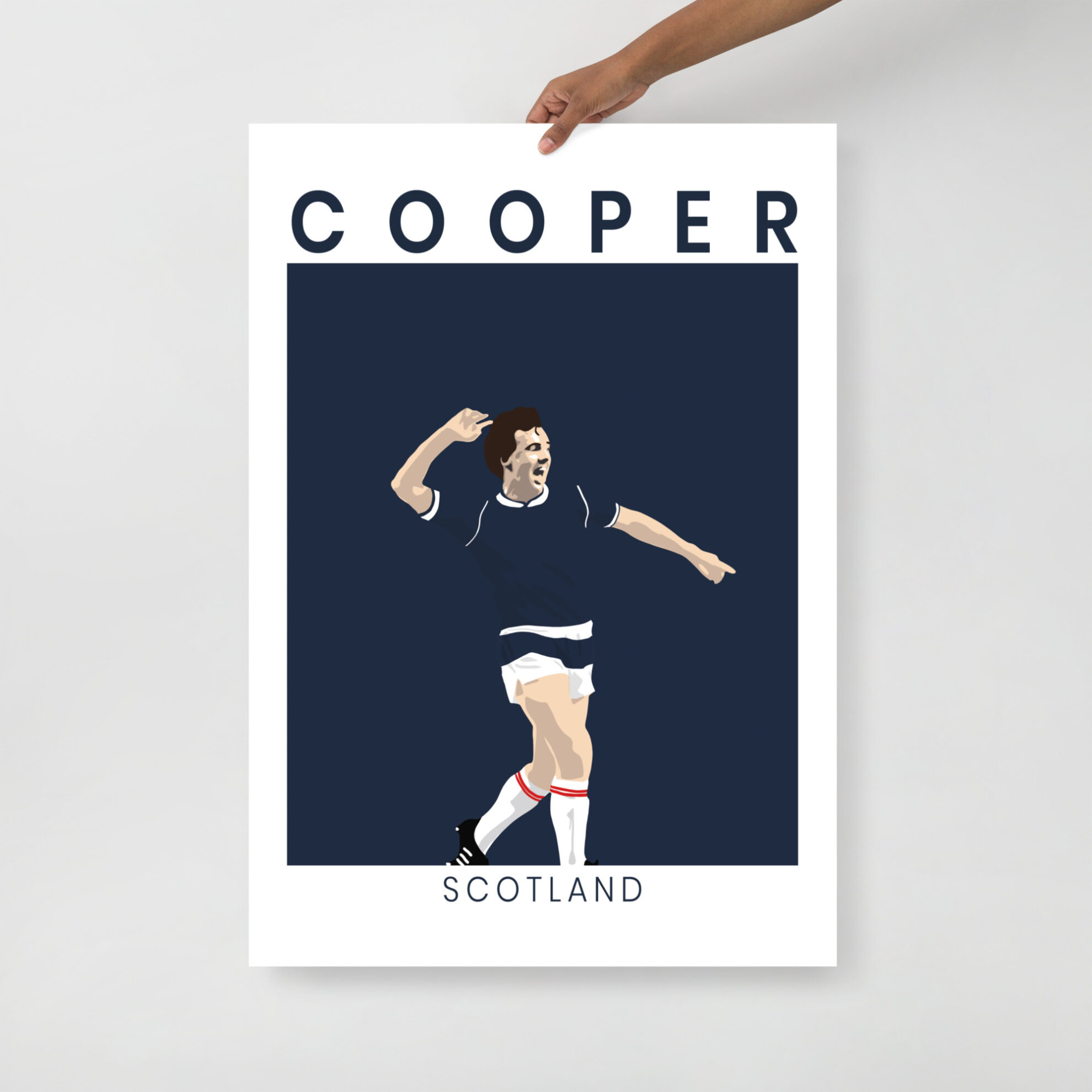 Bring the magic of the “Moodie Blue” into your home or office with this striking Davie Cooper Scotland art print. This design moves away from our traditional sunburst style to offer a sophisticated, minimalist illustration of Davie Cooper in his prime, celebrating an iconic moment for the national team. The high-contrast artwork features the winger in the classic Scotland dark blue, with the text COOPER and SCOTLAND framing the action in a clean, modern layout.