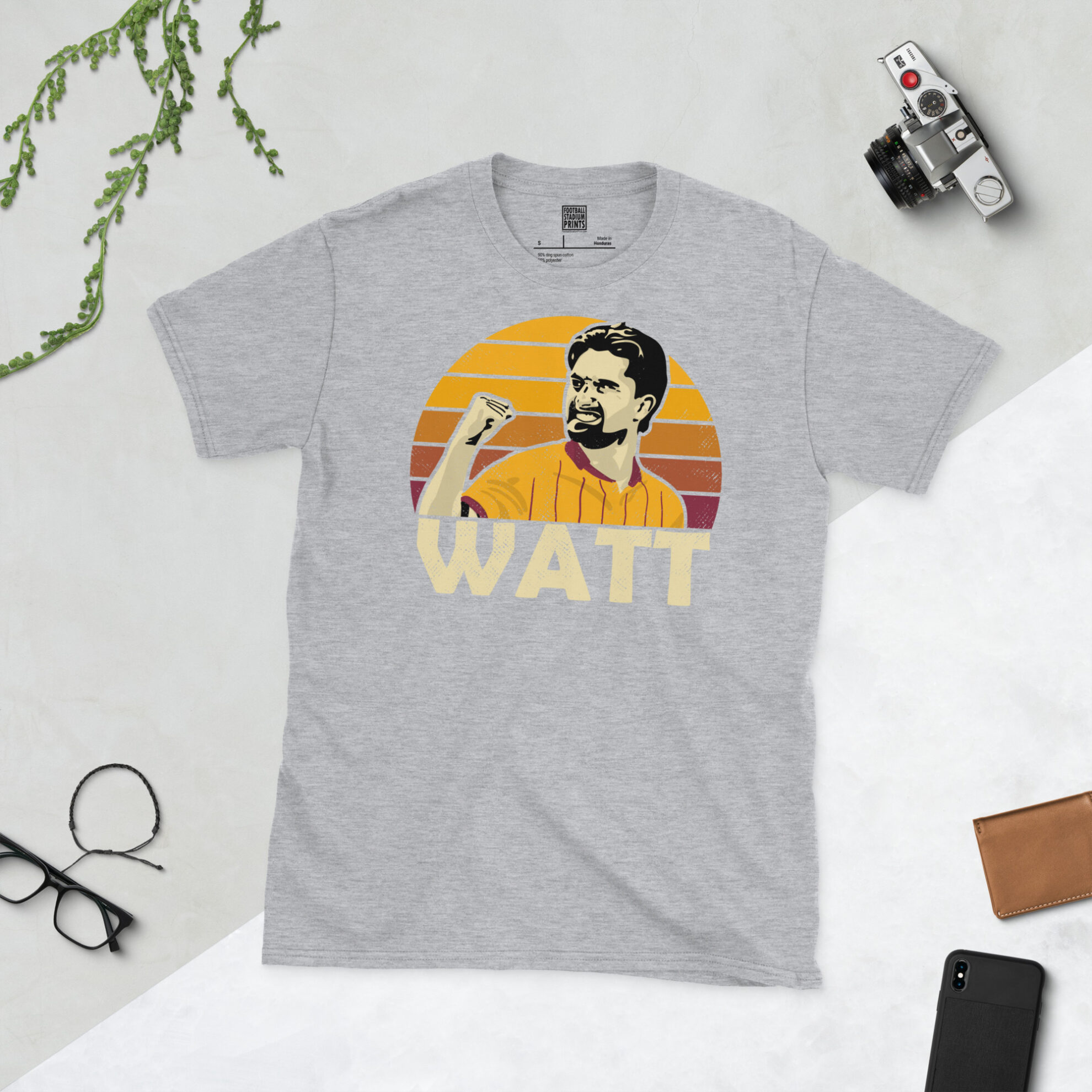 Honour the midfield creativity and tenacity of Elliot Watt with this superb retro T-shirt! The design features an artistic, distressed portrait of the player, set against a classic claret and amber sunburst background. His surname, WATT, is proudly displayed beneath the graphic.