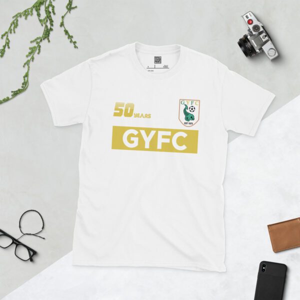 Celebrate 50 years with this youth kit-inspired tee! Features GYFC sponsor text, club crest and anniversary branding. Available in 5 colours (sizes S-XXXL).