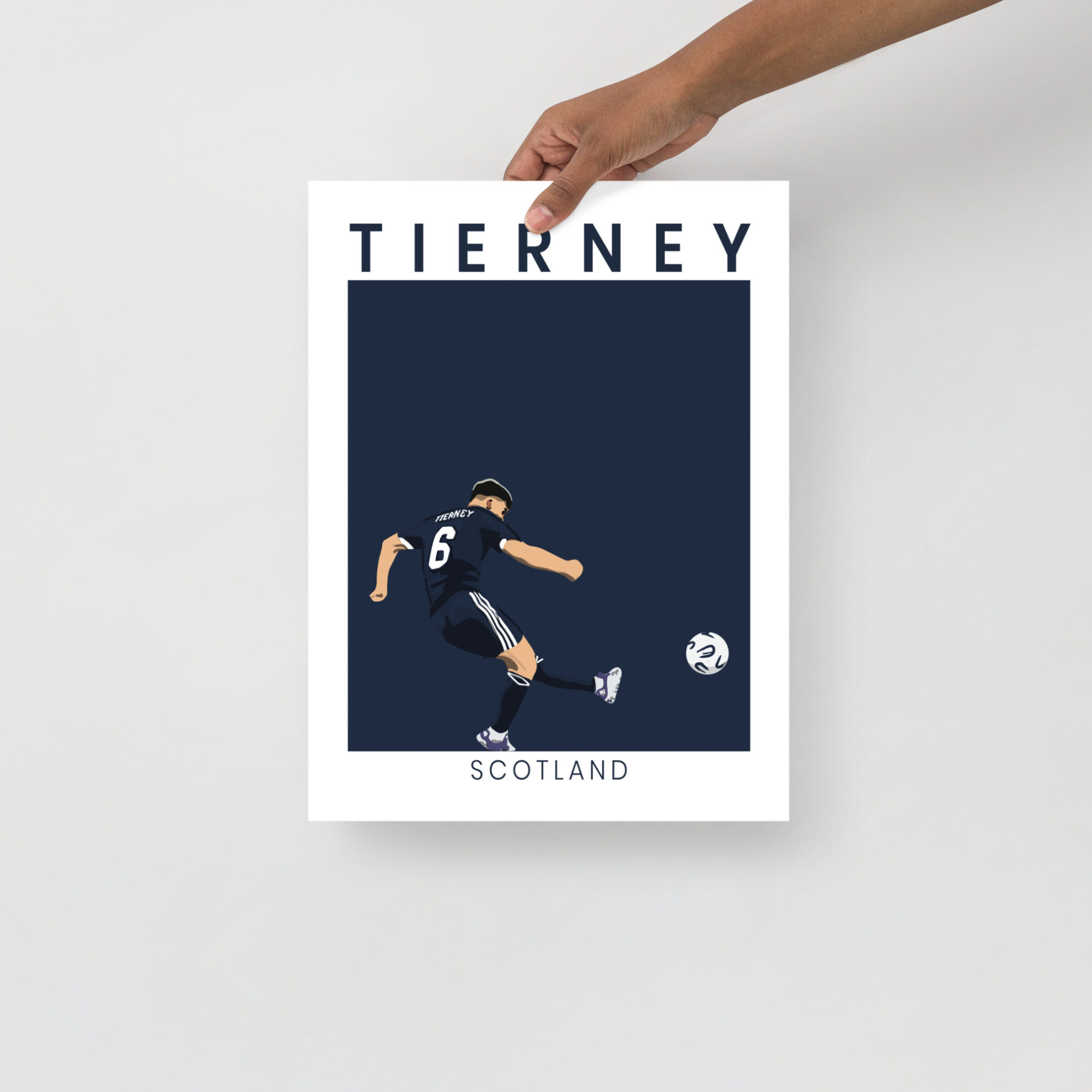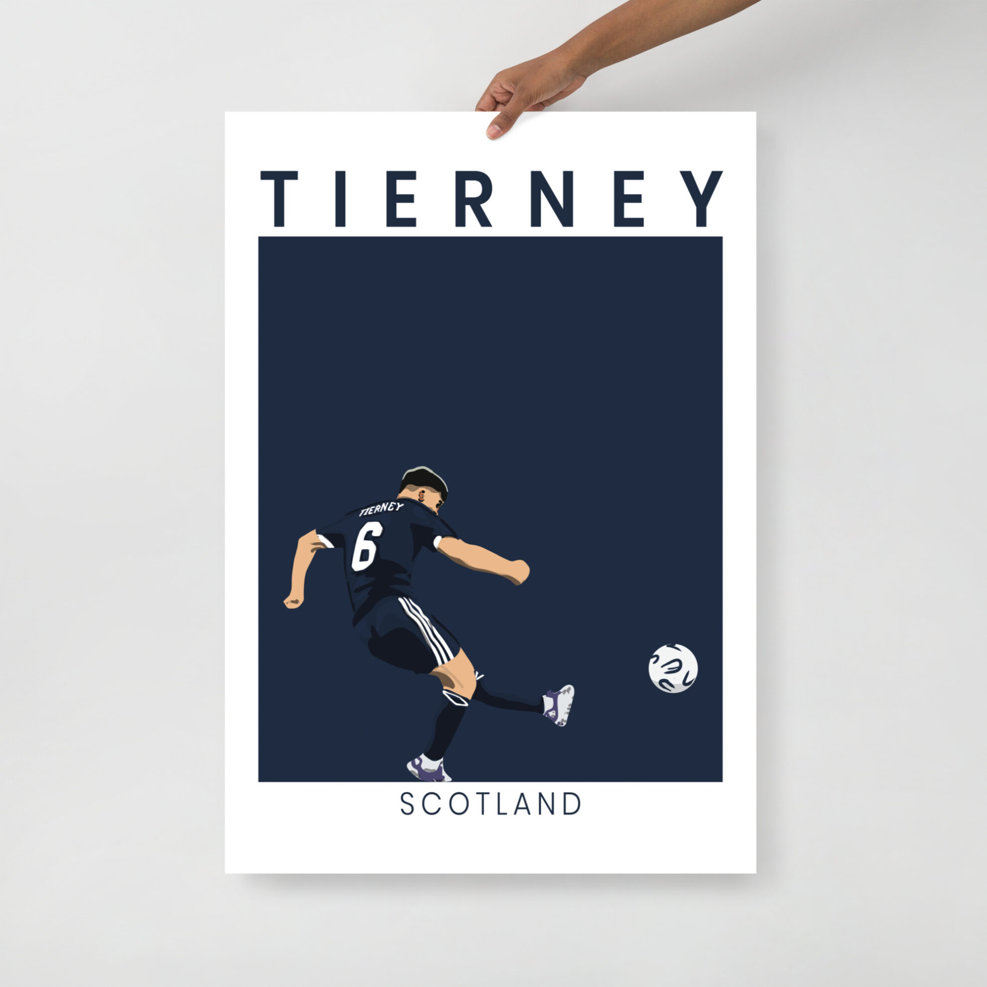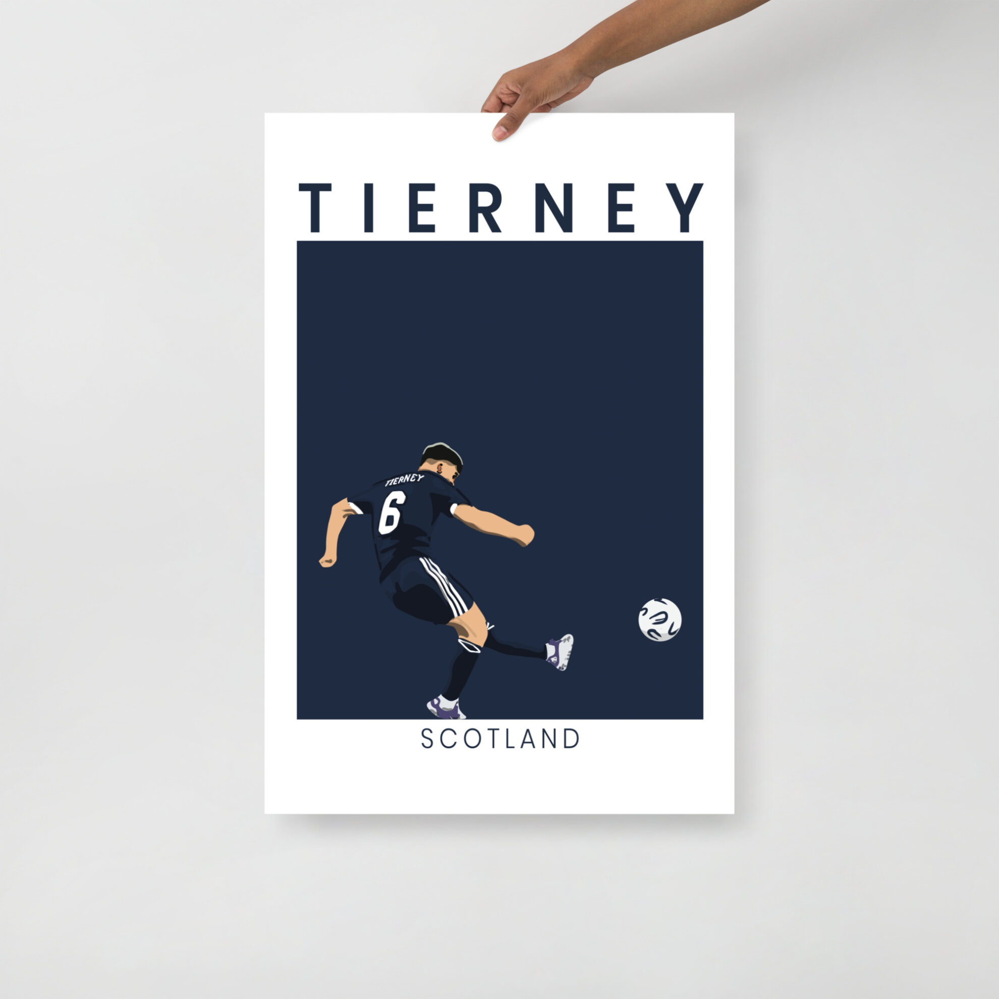 Celebrate the tenacity of Scotland’s favourite “hard man” with this Kieran Tierney action print. Capturing Tierney in his signature marauding style, this print commemorates his vital goal in the 4-2 win over Denmark. This victory ensured Steve Clarke’s side qualified for the 2026 World Cup at the very top of their group. The design is sleek and modern, utilizing a deep navy palette that looks stunning in any home office or fan cave.