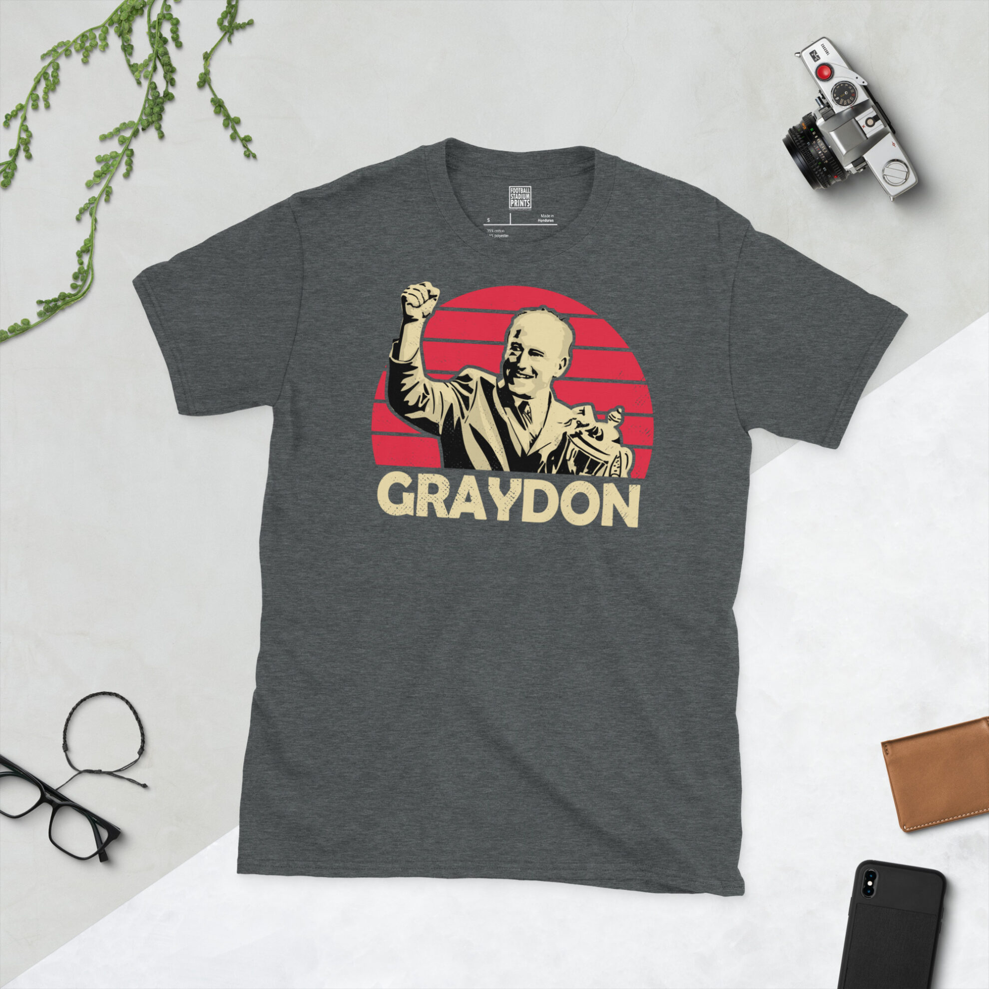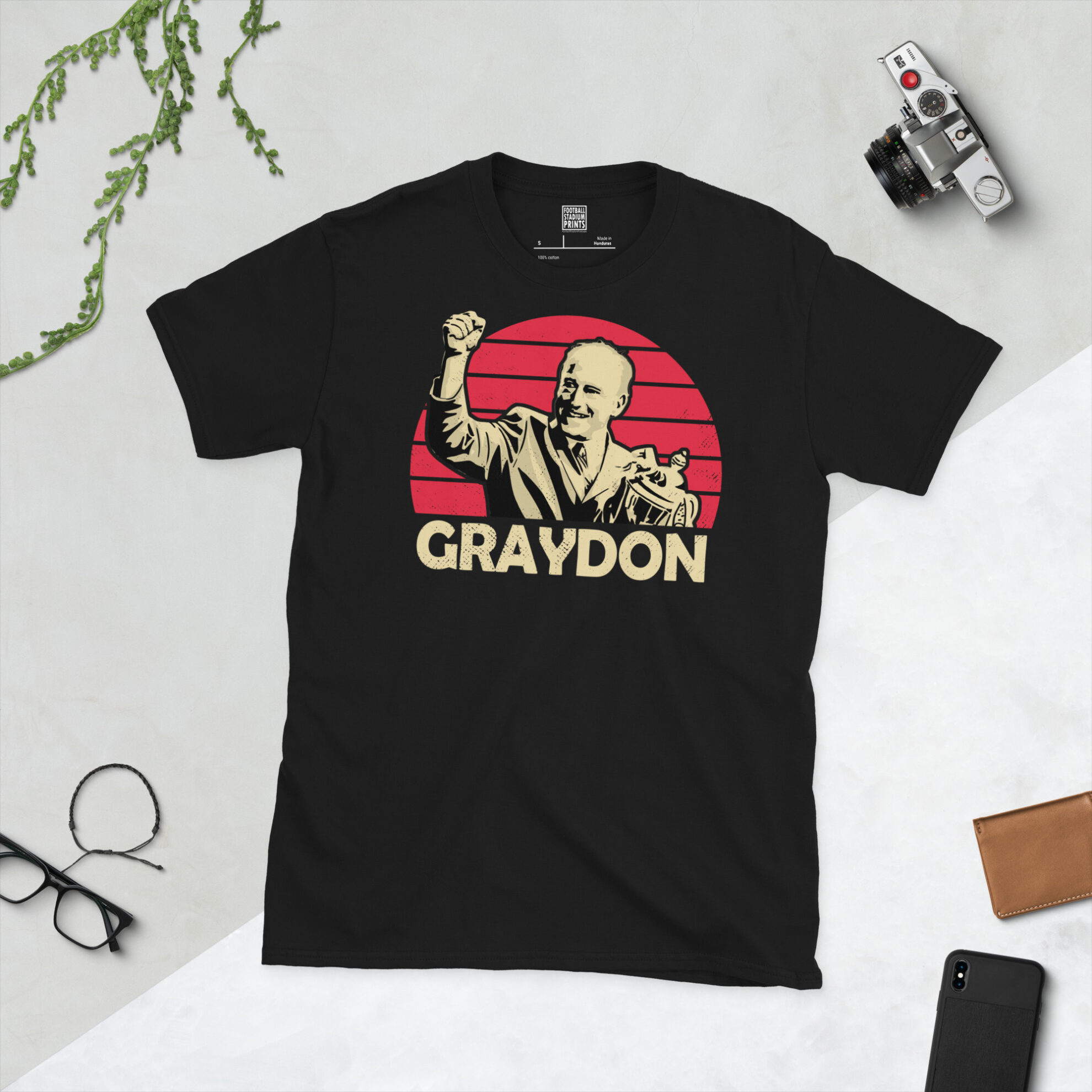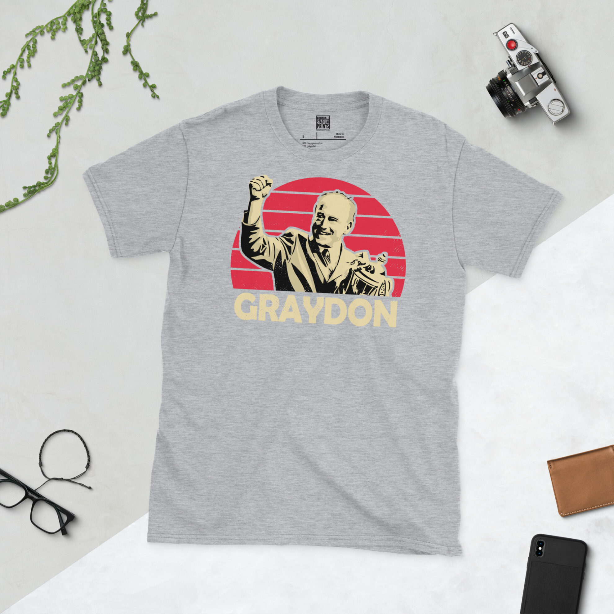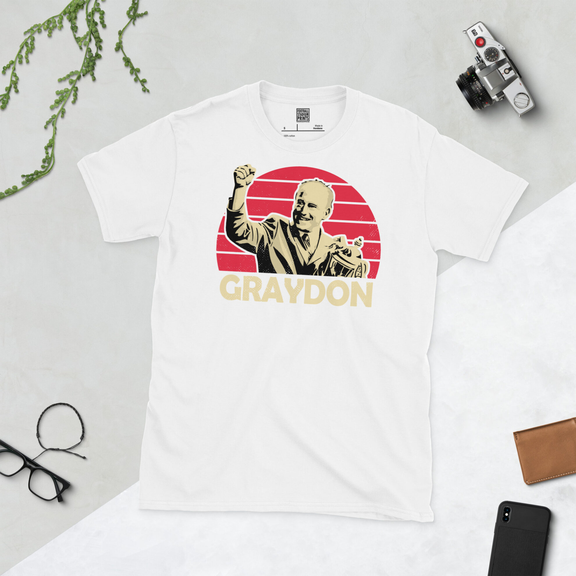 Pay tribute to a true icon of the Bescot Stadium with this high-definition Ray Graydon T-shirt. The design features a striking distressed red sunburst backdrop, capturing the moment of triumph as Graydon celebrates with a trophy. Finished with bold GRAYDON typography, this shirt is a must-have for any fan who remembers the incredible play-off victories and the disciplined, hard-working spirit he instilled in the club.