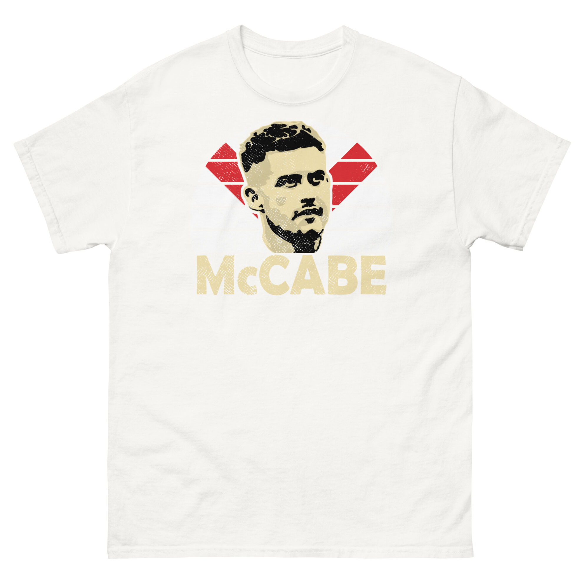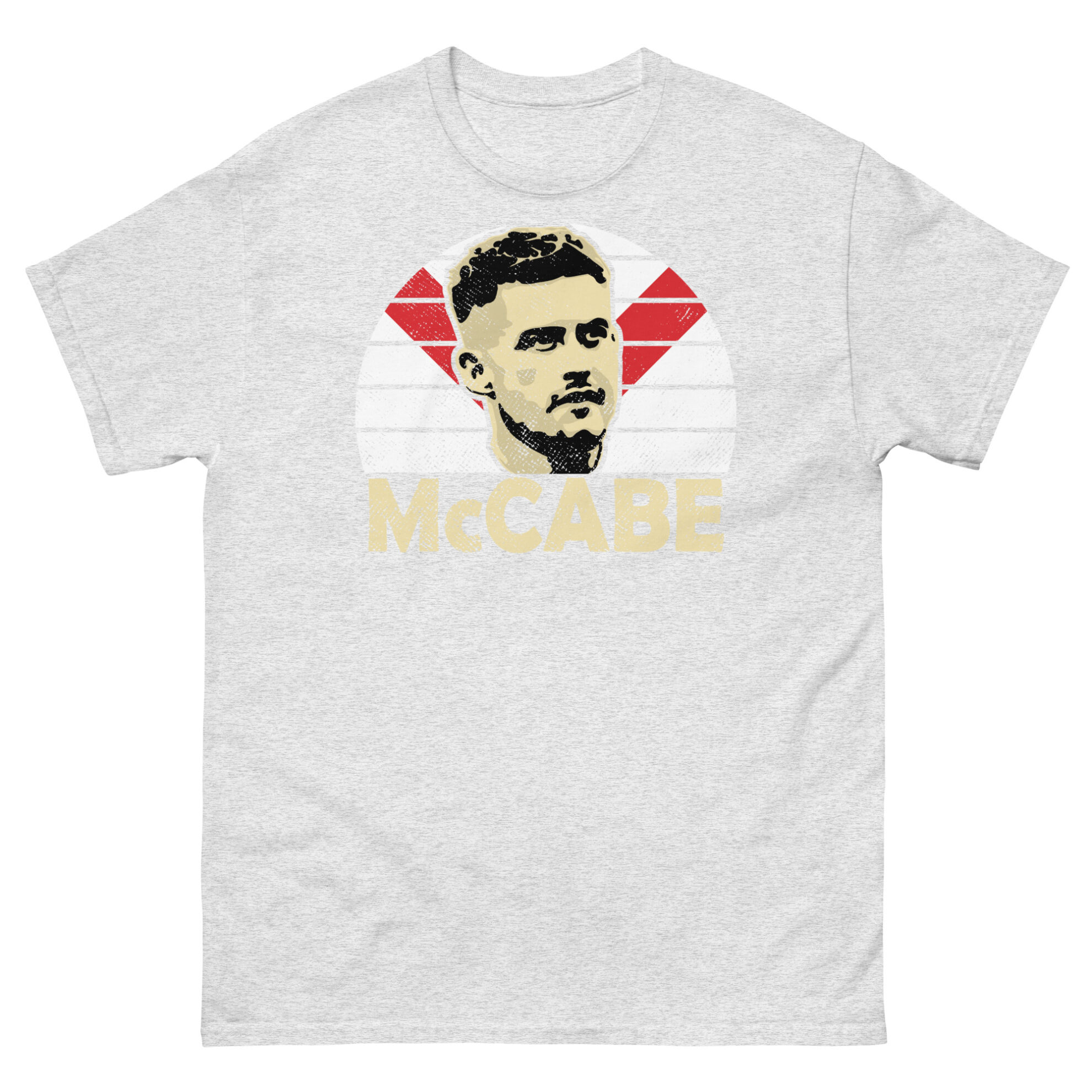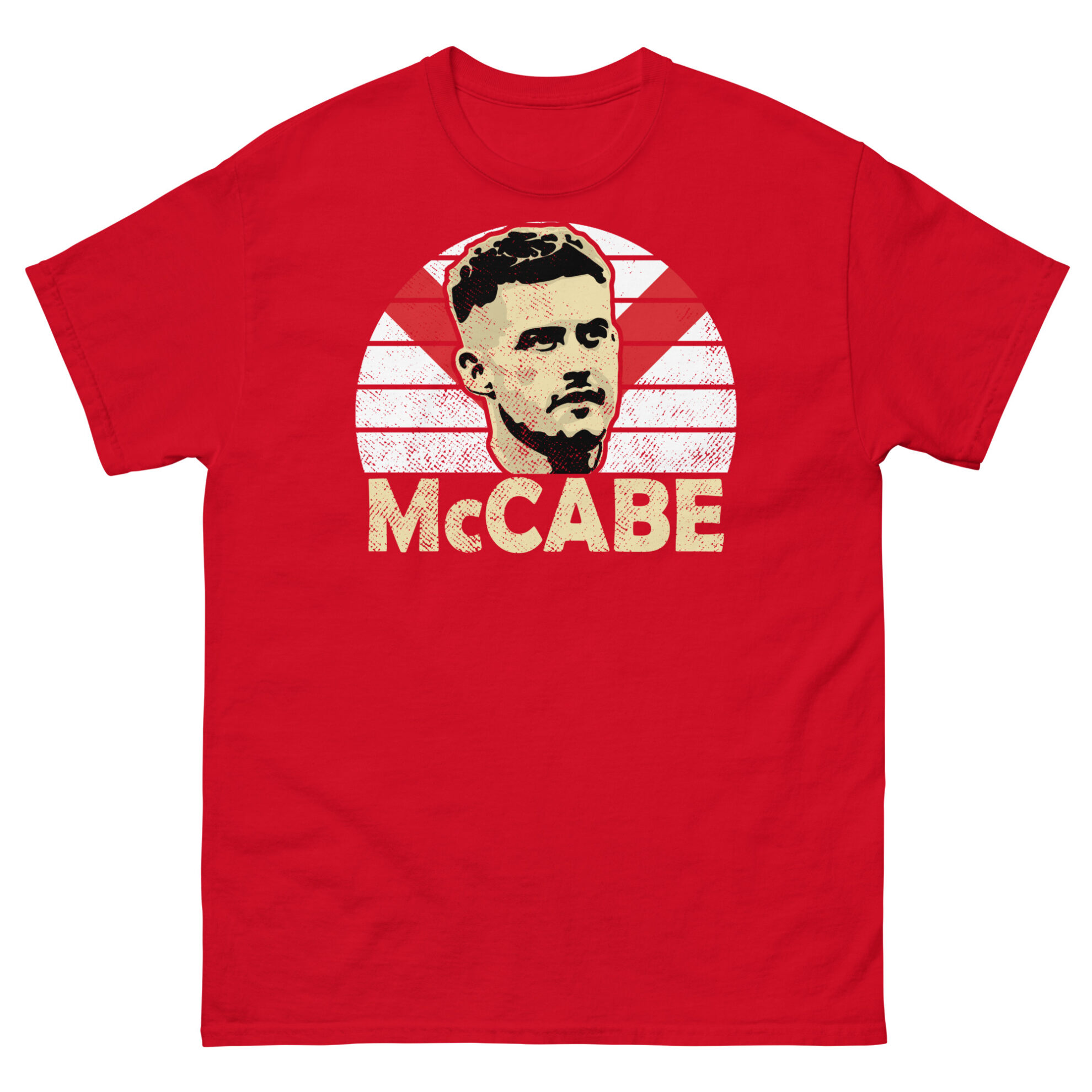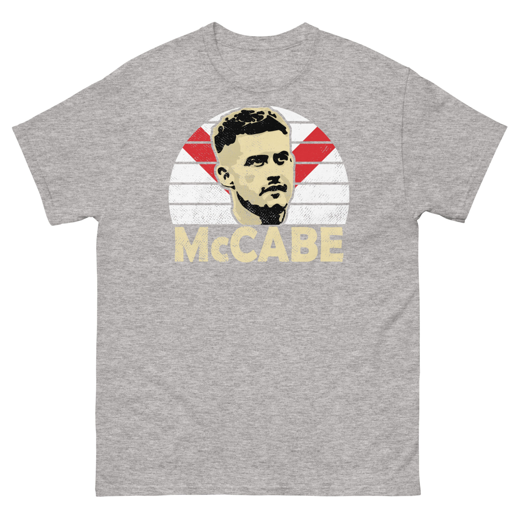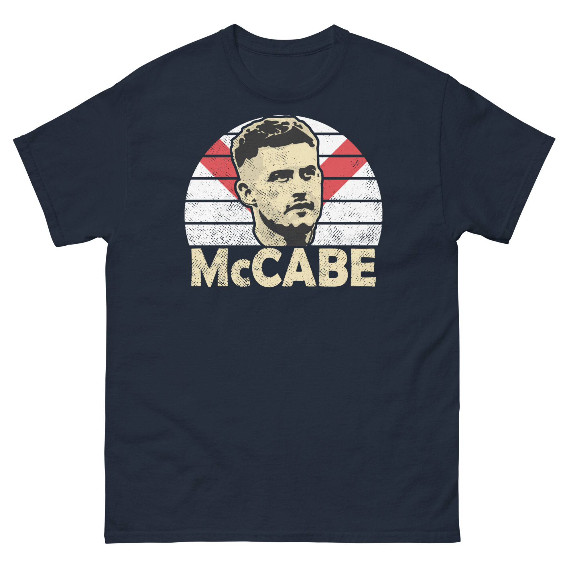 Featuring a vibrant sunburst design in the iconic red and white of Airdrieonians F.C., the T-shirt prominently displays “MCCABE” in bold letters, capturing the essence of this beloved figure. Crafted from high-quality materials for comfort and durability, this T-shirt is available in Black, Navy, and Heather, ensuring a perfect match for your Diamonds colours.