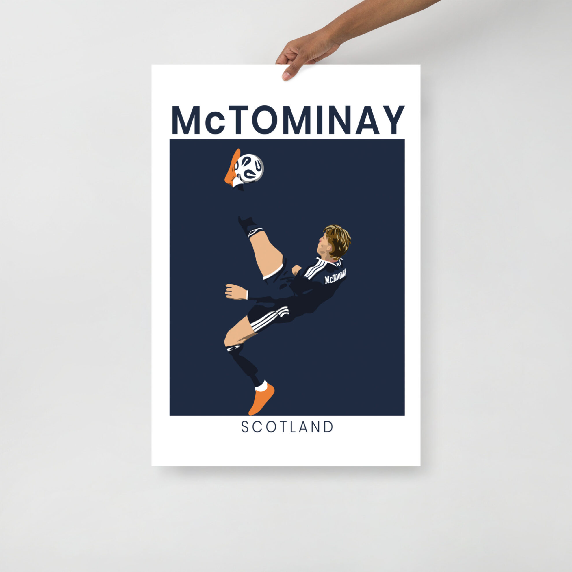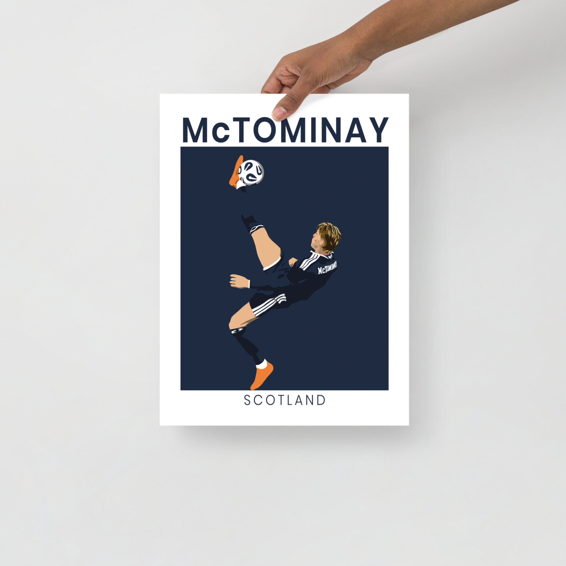 Relive the moment Hampden Park stood still. This premium art print captures Scott McTominay’s gravity-defying overhead kick during Scotland’s historic 4-2 victory over Denmark—the win that sent the Tartan Army to the 2026 World Cup as group winners. The minimalist navy design features the iconic silhouette of the “McTerminator” in mid-air, framed by bold McTOMINAY and SCOTLAND typography.
