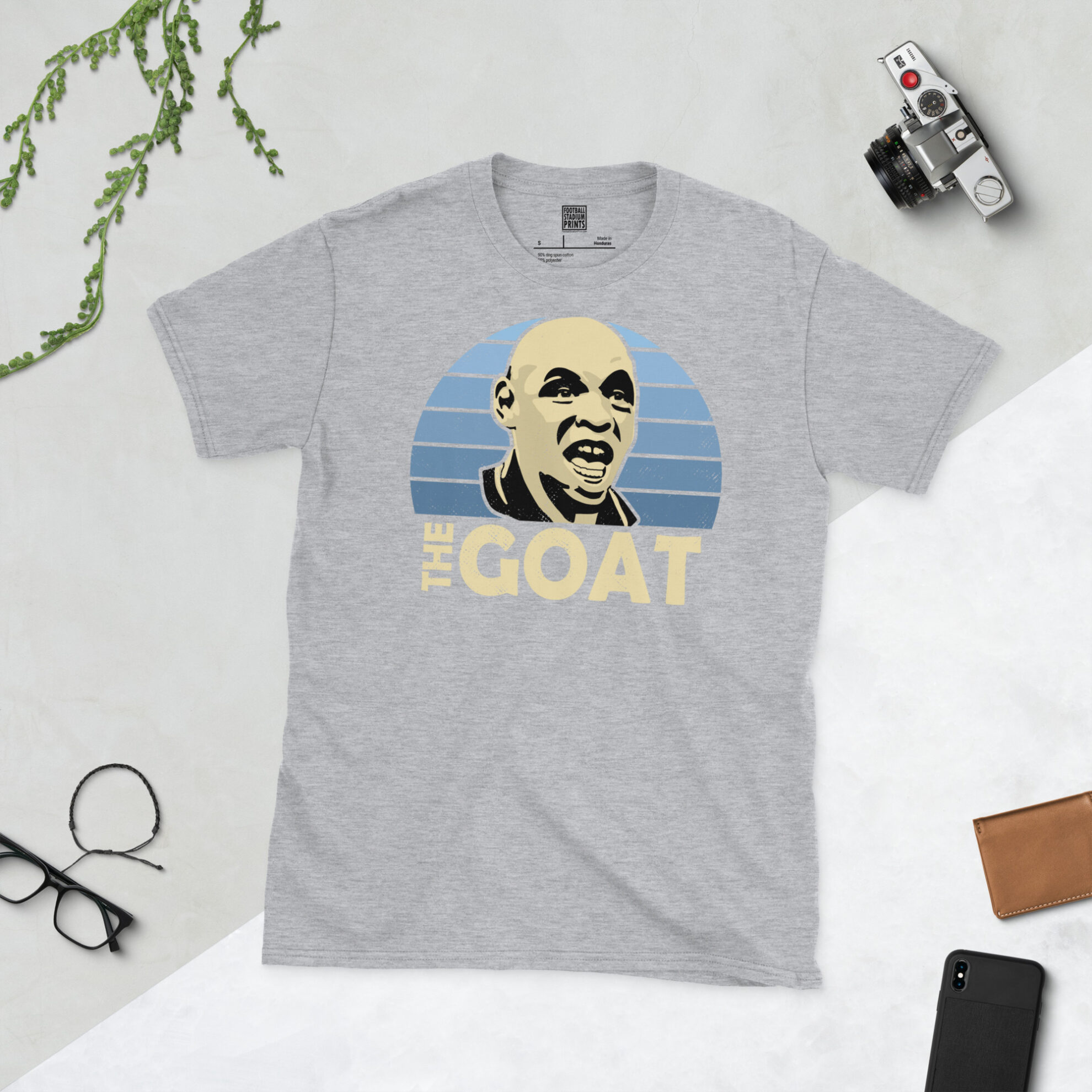 Pay tribute to one of the most beloved figures in Manchester City history, Shaun Goater, with this superb retro T-shirt! The design features an artistic, distressed portrait of the legendary striker, set against a striking sky blue striped sunburst background that evokes the spirit of Maine Road. His iconic nickname, THE GOAT, is proudly displayed in bold text beneath the main graphic.