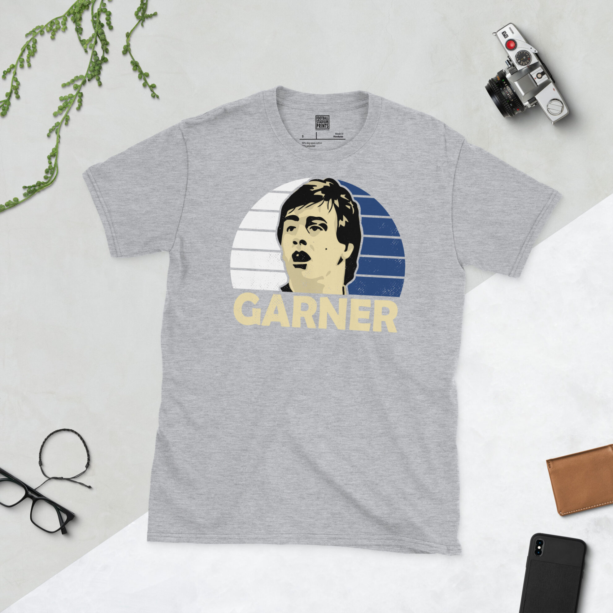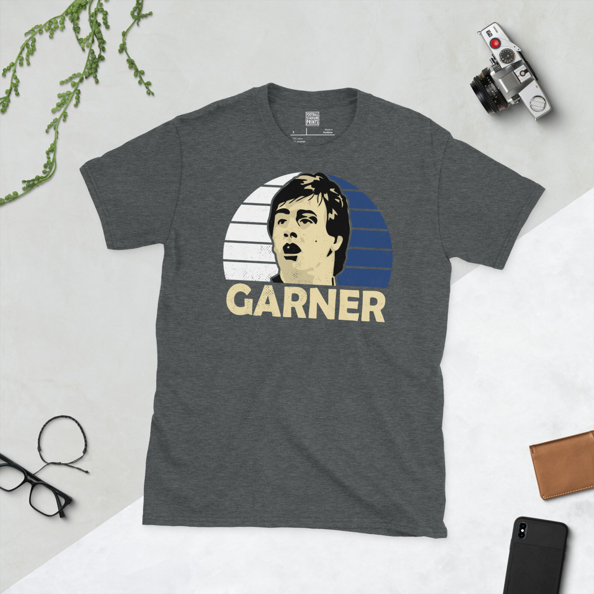 Pay tribute to a goalscoring machine with this Simon Garner retro T-shirt! The design features a stylised, distressed portrait of the Rovers’ greatest-ever marksman, set against a striking blue and white striped sunburst—the iconic colours of the Blackburn Rovers home strip. His surname, GARNER, is boldly displayed beneath the main graphic.