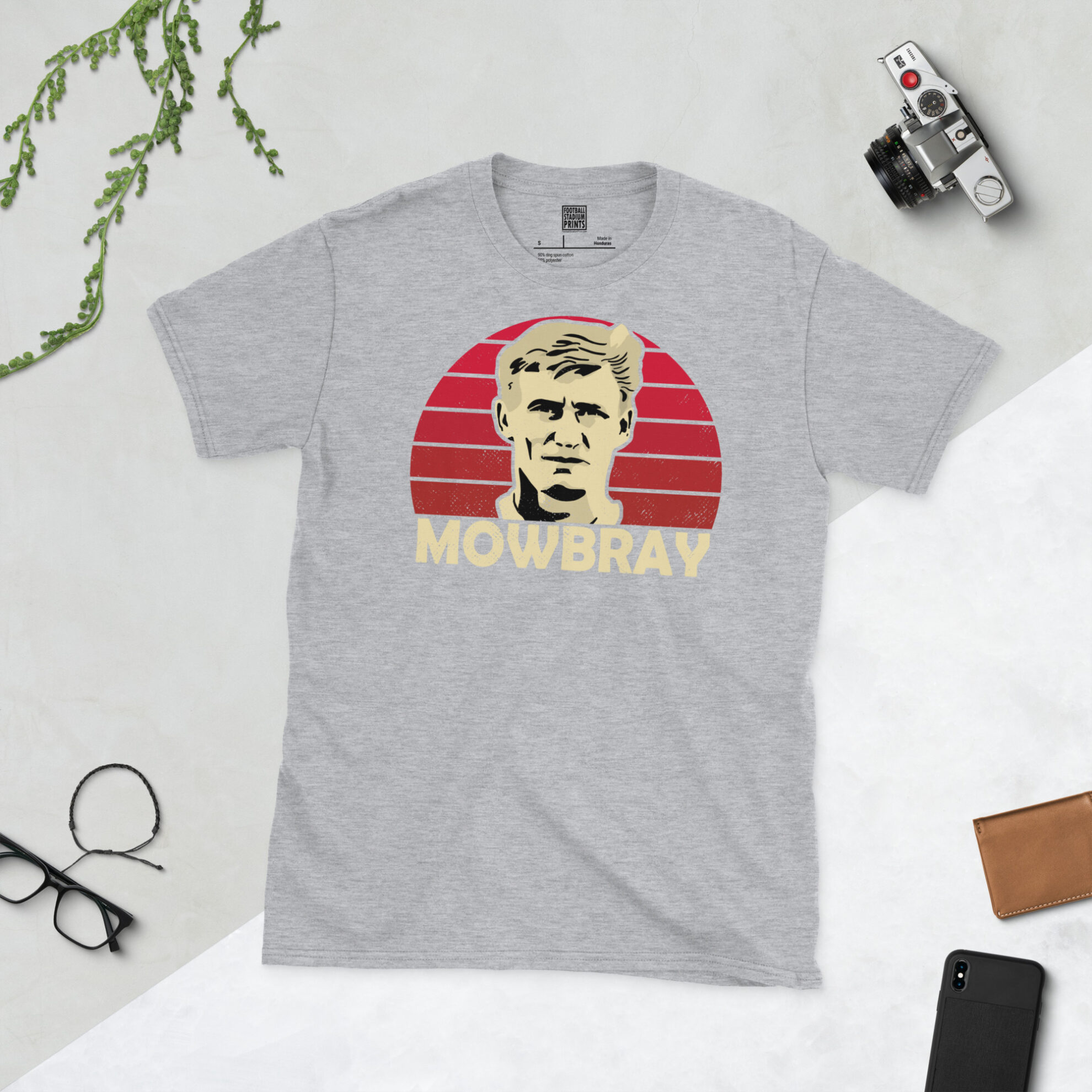 Honour the ultimate Middlesbrough icon with this superb Tony Mowbray retro T-shirt! The design features an artistic, distressed portrait of the legendary captain and manager, set against a striking red striped sunburst background that captures the heartbeat of Teesside. His surname, MOWBRAY, is proudly displayed in bold text beneath the main graphic.